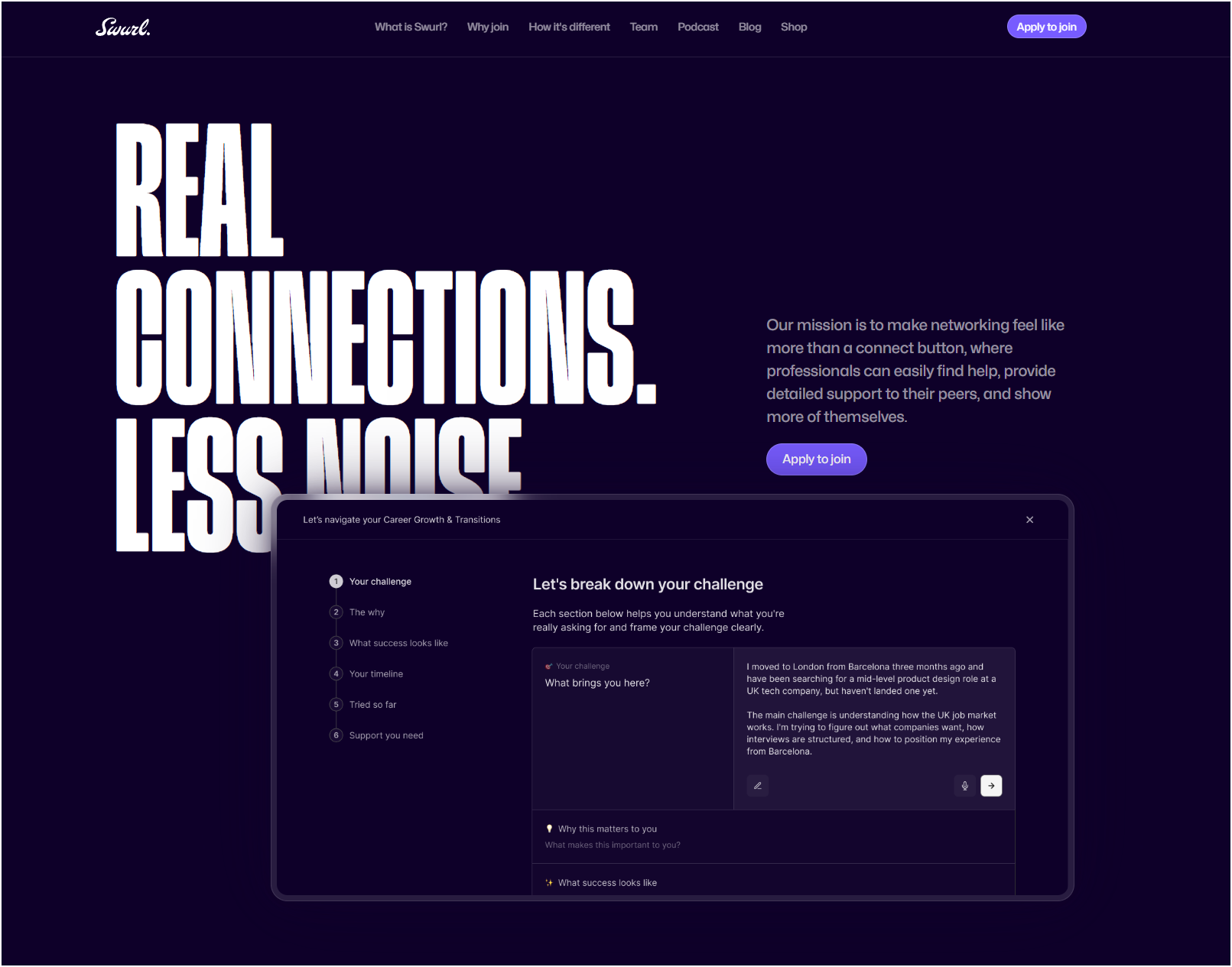 "You shouldn't have to brand yourself just to get honest career advice. Swurl is peer-to-peer mentorship without gatekeeping and self-promotion."